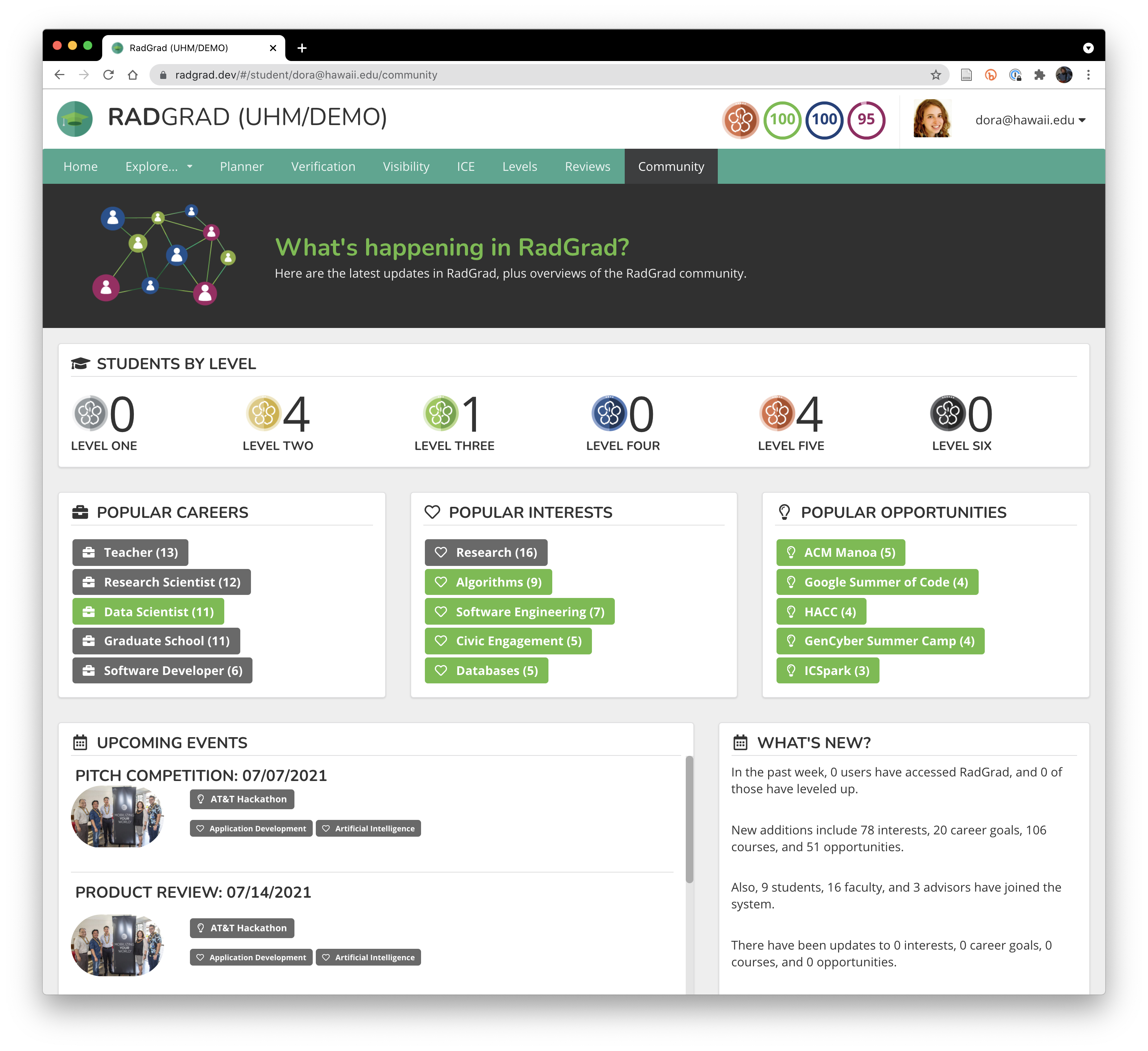 The Community page provides a grab-bag of components that provide information about the RadGrad community.